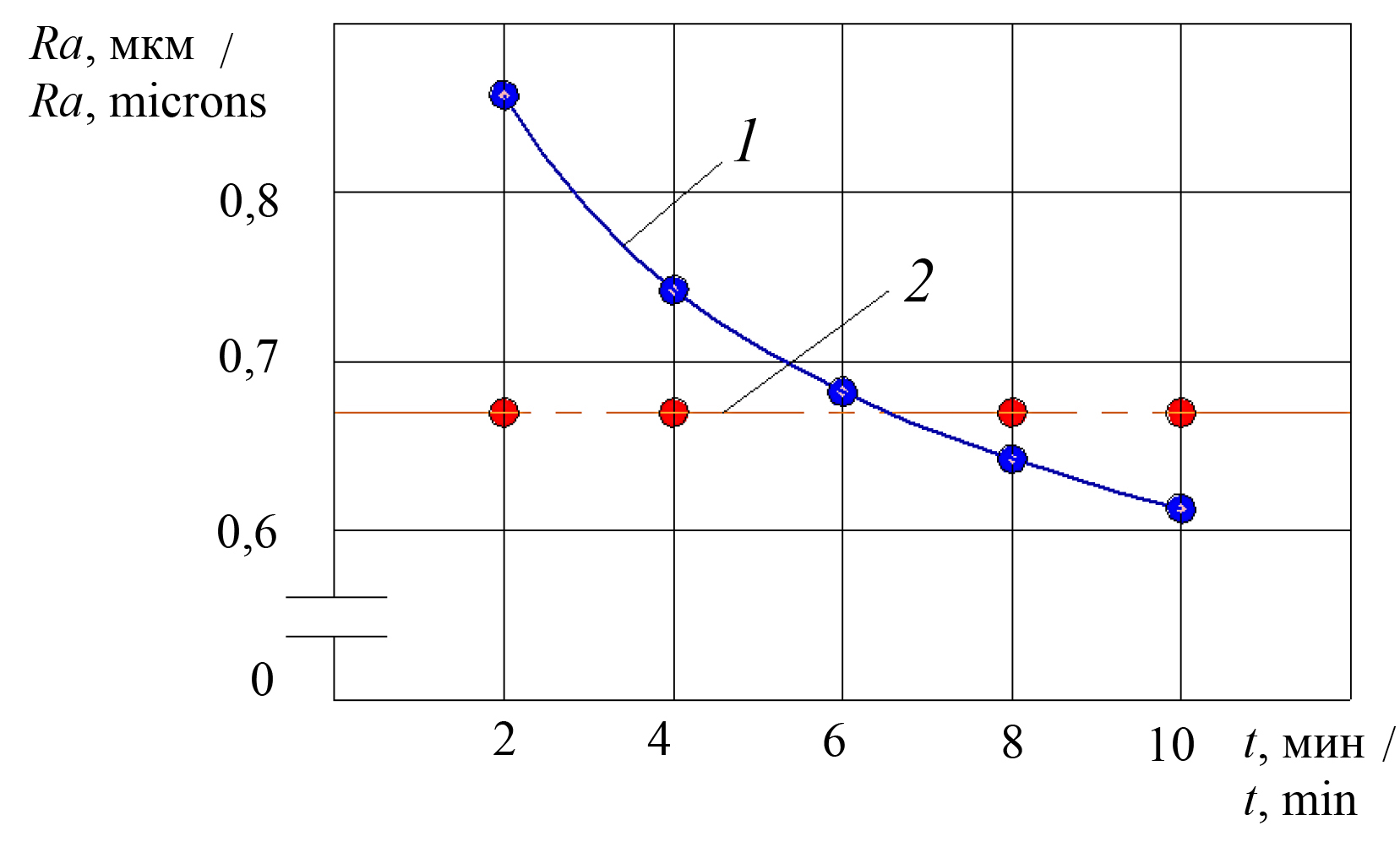 Опытным путем было установлено, что за указанный промежуток времени обеспечивается заданная техническими требованиями шероховатость, и превышение отмеченного времени экономически неэффективно. Анализ данных по времени обработки также показывает, что график переходит в стадию горизонтального выравнивания с приближением к значению шероховатости, которое характерно для данного метода обработки, отражая тем самым окончание создания заданного регулярного рабочего рельефа.
