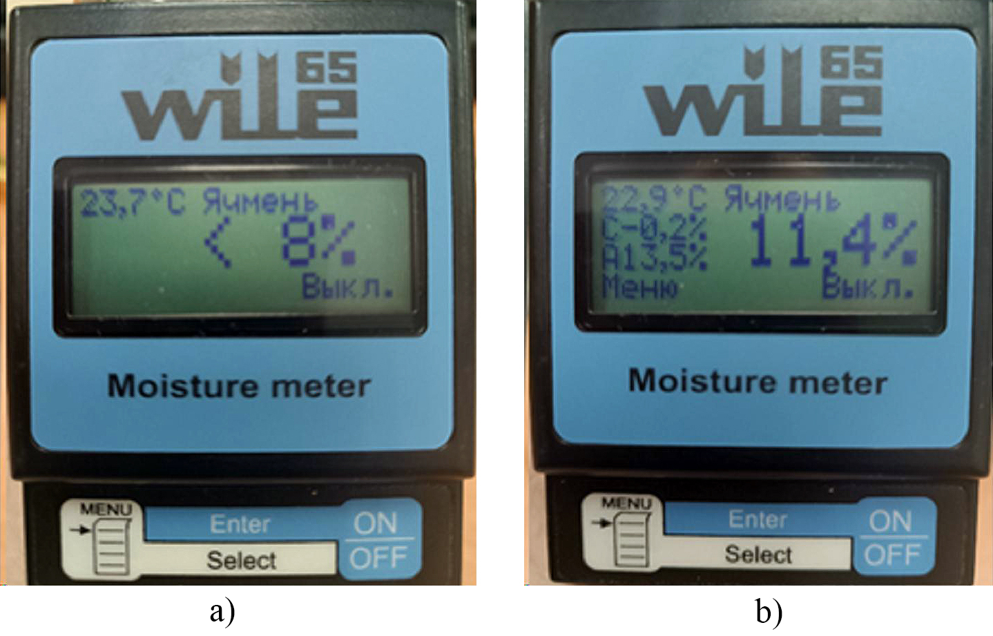 Рис. 3. Примеры измерения влажности влагомером модели Wile-65: a) микронизированное зерно; b) немикронизированное зерно