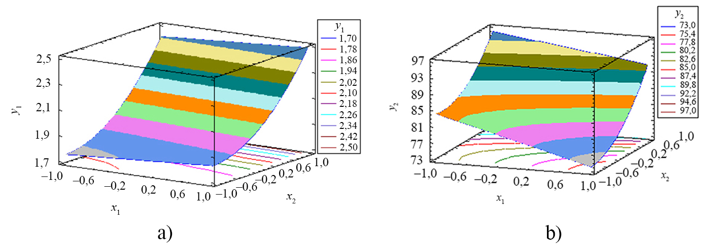 По результатам обработки экспериментальных данных получены поверхности отклика (рис. 5) и описывающие их математические модели (1), (2).