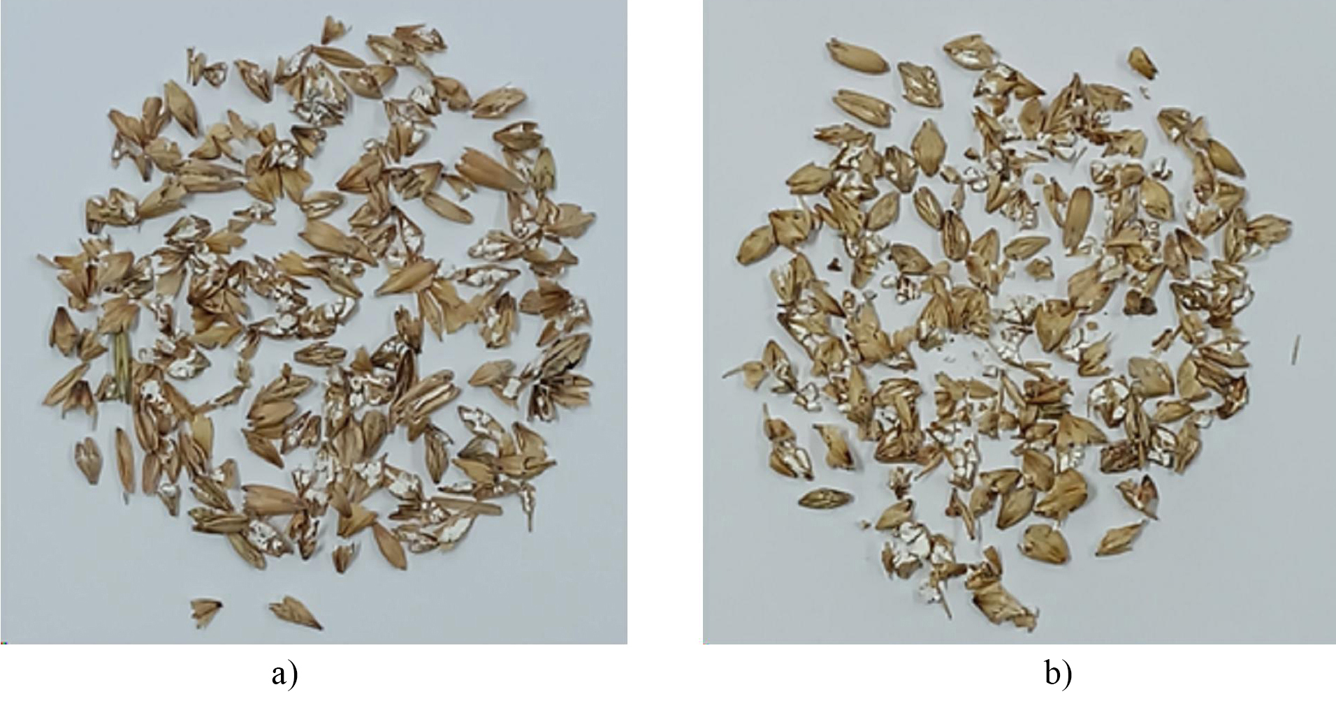 Fig. 10. The results of the flattening non-micronized grain, clearance gap 0.7 mm, n = 300 r/min: a) dry; b) moistened