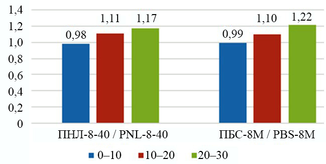 Экспериментально-теоретическими исследованиями эксплуатационных показателей агрегатов с плугами ПНЛ-8-40 и ПБС-8М с трактором тягового класса 5 К-701 установлена производительность за час основного времени разработанного восьмикорпусного плуга ПБС-8М на 30–33 % выше производительности серийного восьмикорпусного плуга ПНЛ-8-40 (рис. 9). На скорости 2,53 м/с К-701+ПНЛ-8-40 погектарный расход топлива составил 17,4 кг/га, ниже на 22 % 701+ПБС-8М – 13,6 кг/га.