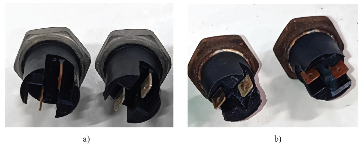 2. Fig. 1. General view of the reversing switches of the combine harvester C-versions with copper terminals: a) before; b) after exposure to salt spray