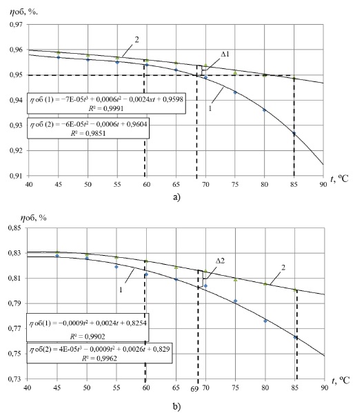 b) hydraulic pump of the Danfoss Power Solutions 90-series volumetric hydraulic drive with the brands of hydraulic oils under study, depending on temperature: 1 – curve of determining the volumetric efficiency for the new and having operating time