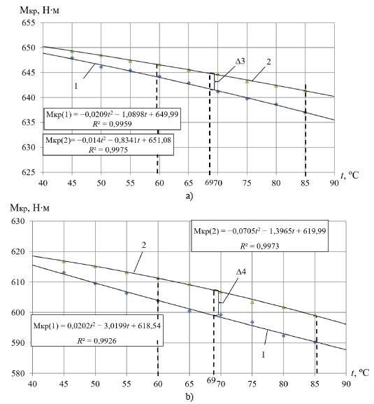 (б) гидромотора объемного гидропривода Danfoss Power Solutions серии 90 с исследуемыми марками гидравлических масел в зависимости от температуры: 1 – кривая определения крутящего момента нового и имеющего наработку гидромотора