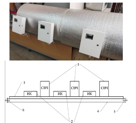 Установка представляет собой ленточный транспортер (рис. 1), на котором размещены ИК-модули и камеры с вентиляторами, позволяющие при необходимости подключать СВЧ-модуль. Камера решает задачи отвода водяных паров из внутреннего пространства сушилки. Модуль ИК-обработки содержит два кварцевых ИК-излучателя, расположенных на расстоянии 13 см от поверхности ленты транспортера. Мощность излучателей регулируется тиристорными регуляторами напряжения в диапазоне от 0 до 1100 Вт.