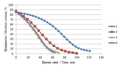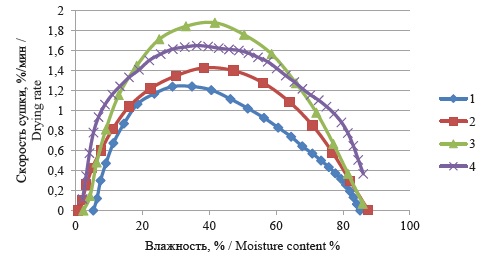 С уменьшением скорости ленты до 10 мм/с происходит увеличение максимальной скорости сушки, причем максимум достигается раньше, при более высоких значениях влажности. Дальнейшее уменьшение скорости ленты приводит к снижению максимальной скорости сушки, а характер кривой 4 (рис. 3) близок к виду классической кривой скорости сушки с выраженным периодом почти постоянной скорости сушки при влажности от 60 до 25 %, в котором скорость сушки находится в пределах 1,4 ± 0,1 %/мин.