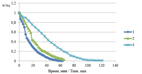 Относительное влагосодержание определяется как отношение разности текущего и равновесного влагосодержания к разности начального и равновесного влагосодержания. Как указано во многих работах [29–33] для овощного сырья равновесное влагосодержание является пренебрежимо малым по сравнению с текущим и тем более начальным влагосодержанием. Тогда относительное влагосодержание может быть определено как отношение текущего влагосодержания к начальному или как отношение текущей массы влаги в продукте к начальной. Текущая масса влаги в продукте определялась при помощи взвешивания на весах как разница между начальной массой влаги в образце и убылью массы продукта в течение процесса.