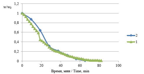 Fig. 2. Carrot drying curves: 1 – belt speed 20 mm/s; 2 – belt speed 15 mm/s;