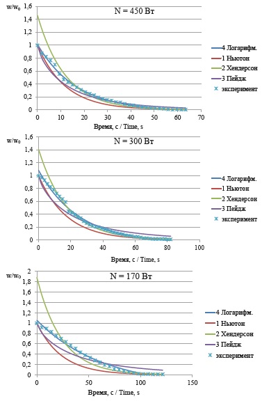 Модель Пейджа для всего диапазона мощностей характеризуется заниженными значениями безразмерного относительного влагосодержания в начале процесса сушки и завышенными значениями ‒ в конце.