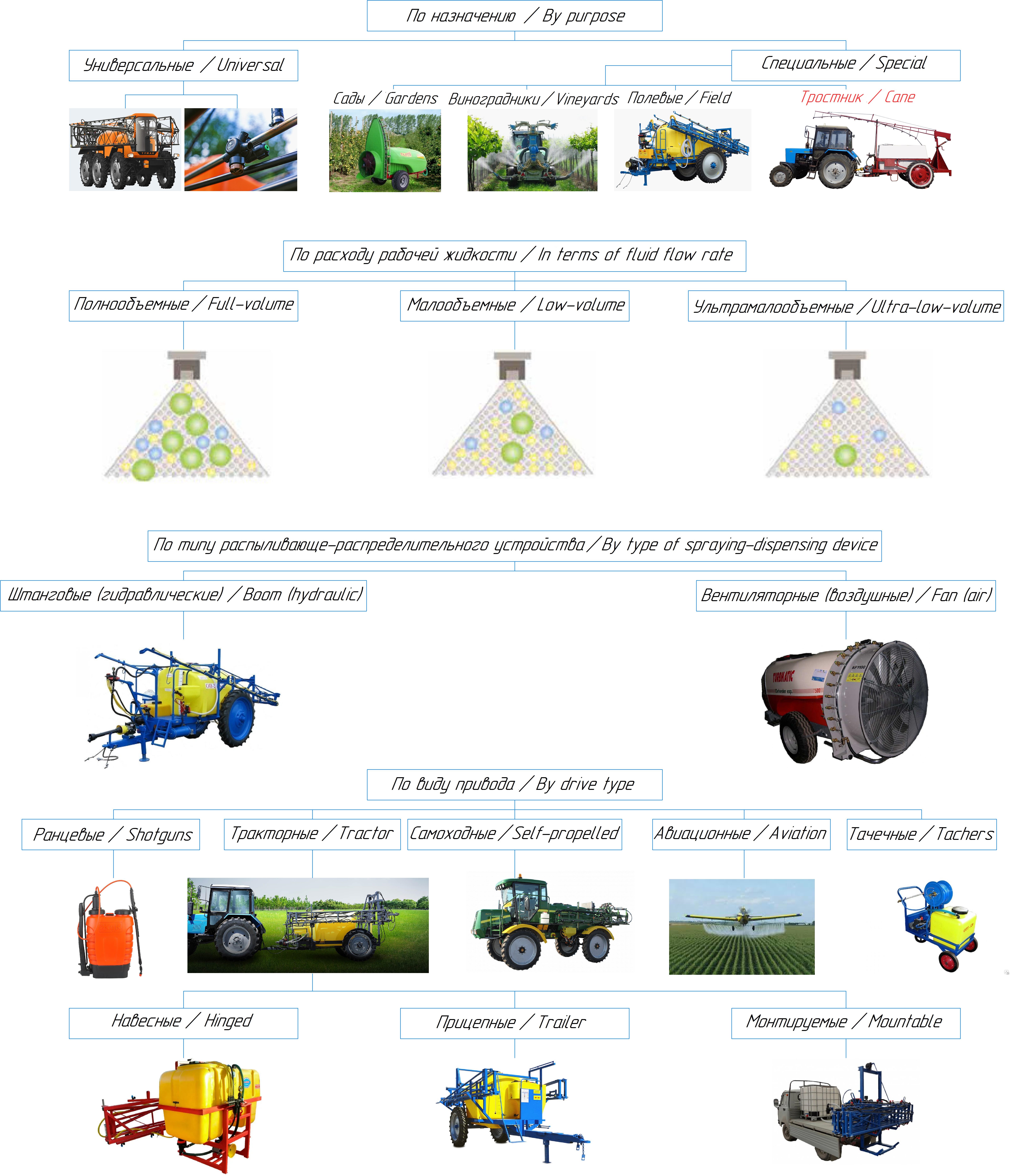 Анализ 75 протоколов испытаний опрыскивателей на машиноиспытательных станциях Поволжская и Сибирская (с 2000 г.), Владимирская (с 2003 г.), Алтайская и Северо-Кавказская (с 2009 г.), Кубанская (с 2011 г.), Кировская (с 2012 г.), Подольская (с 2018 г.), Северо-Западная (с 2018 г.) позволил выбрать возможные решения для обработки тростника в рисовой оросительной системе [28]. Для анализа использовался открытый доступ документов, размещенных на официальных сайтах станций.