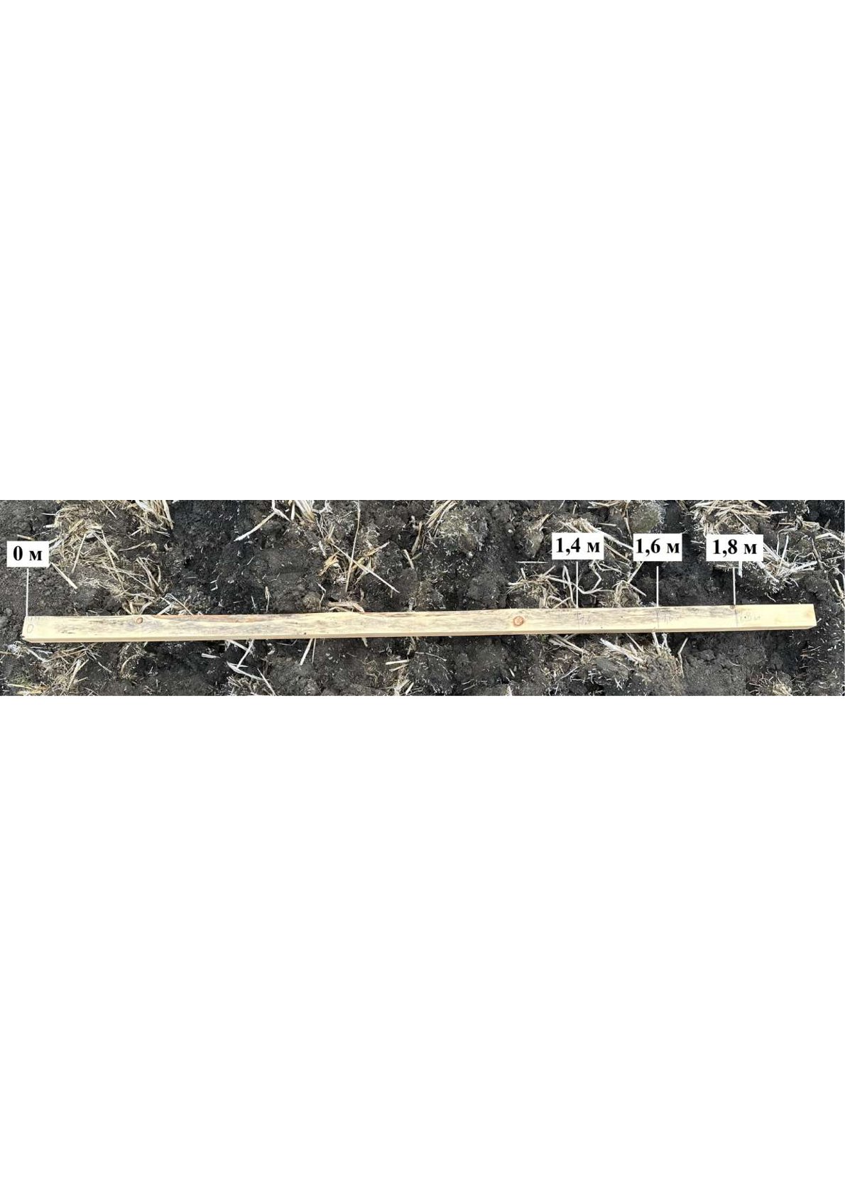 Рейка ложилась в месте движения опрыскивателя перпендикулярно каналу, далее производился замер по вертикали от рейки до почвы в точках 0; 1,4; 1,6; 1,8 м (рис. 7).