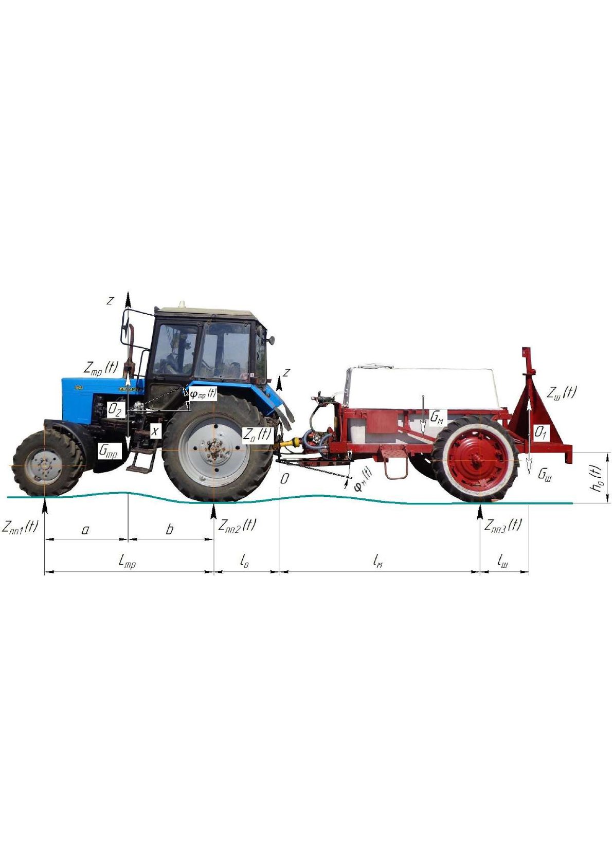 При движении опрыскивателя по поверхности рисового чека трактор перемещается по оси Z на Zтр(t) и совершает угловые колебания φтр(t). На основании этих данных можно получить колебание точки крепления прицепа Zо(t). При этом колебания опрыскивателя в вертикальной плоскости с учетом продольного расположения φм(t).