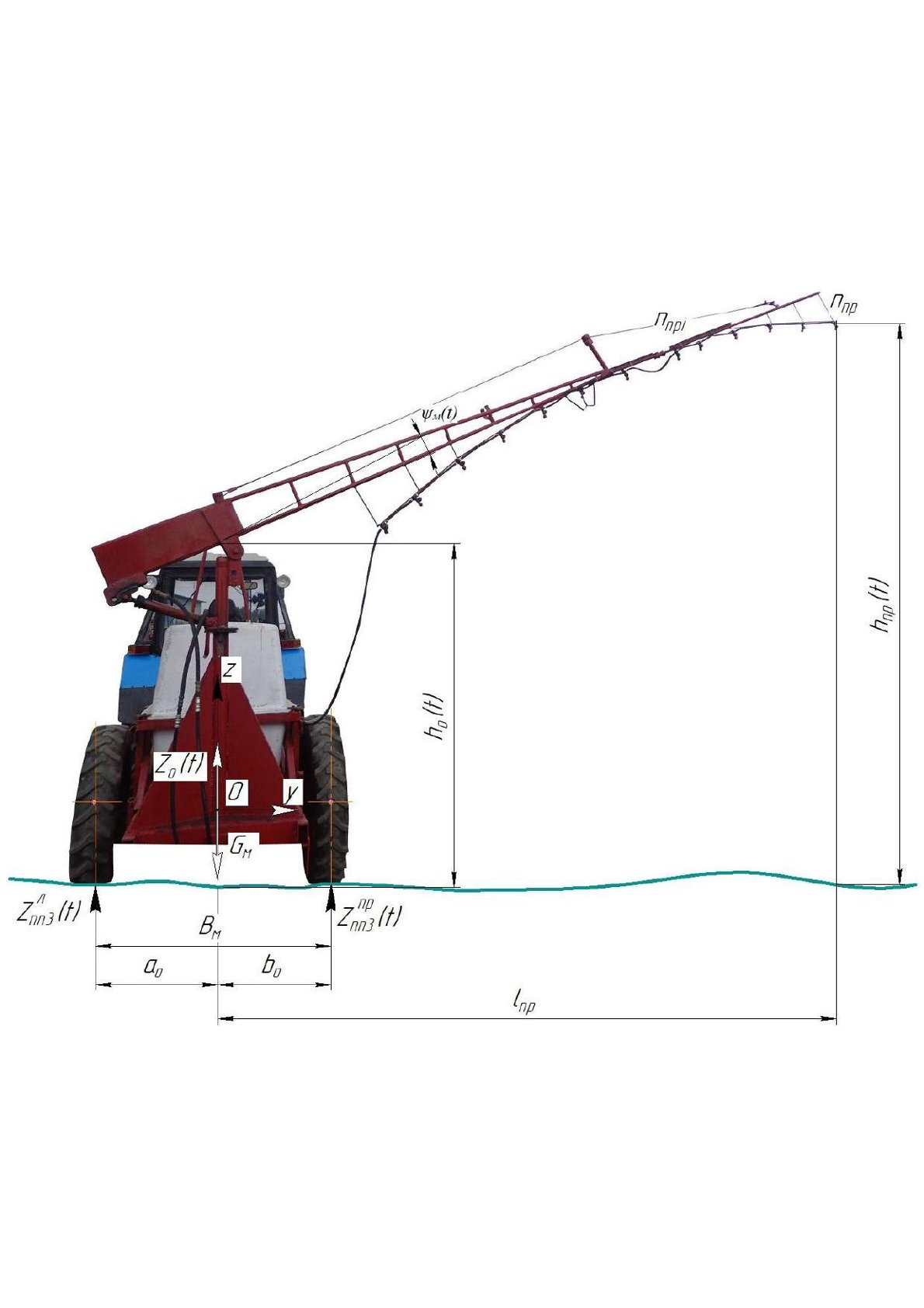 При выполнении технологической операции опрыскивания агрегат, состоящий из трактора и опрыскивателя, находится под внешним воздействием возмущений, зависящих от рельефа соответствующего поля. Данные возмущения вызывают колебания штанги в вертикальном и горизонтальном направлениях, что негативно влияет на качество обработки культуры. В работах П. М. Василенко рассмотрено воздействие таких сил на машинно-тракторный агрегат [13–15].