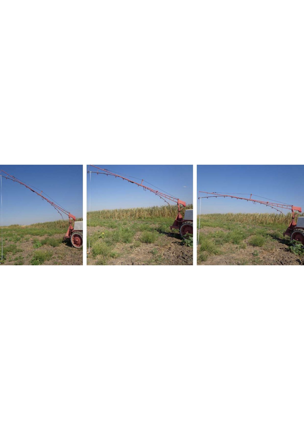 В результате при высоте установки штанги 3,5 м в среднем расстояние от распылителя до поверхности рисового чека по вспашке составляет 3,61 м; стерне риса – 3,55 м; рапсу – 3,52 м; чистому пару – 3,58; озимой пшенице – 3,55 м.