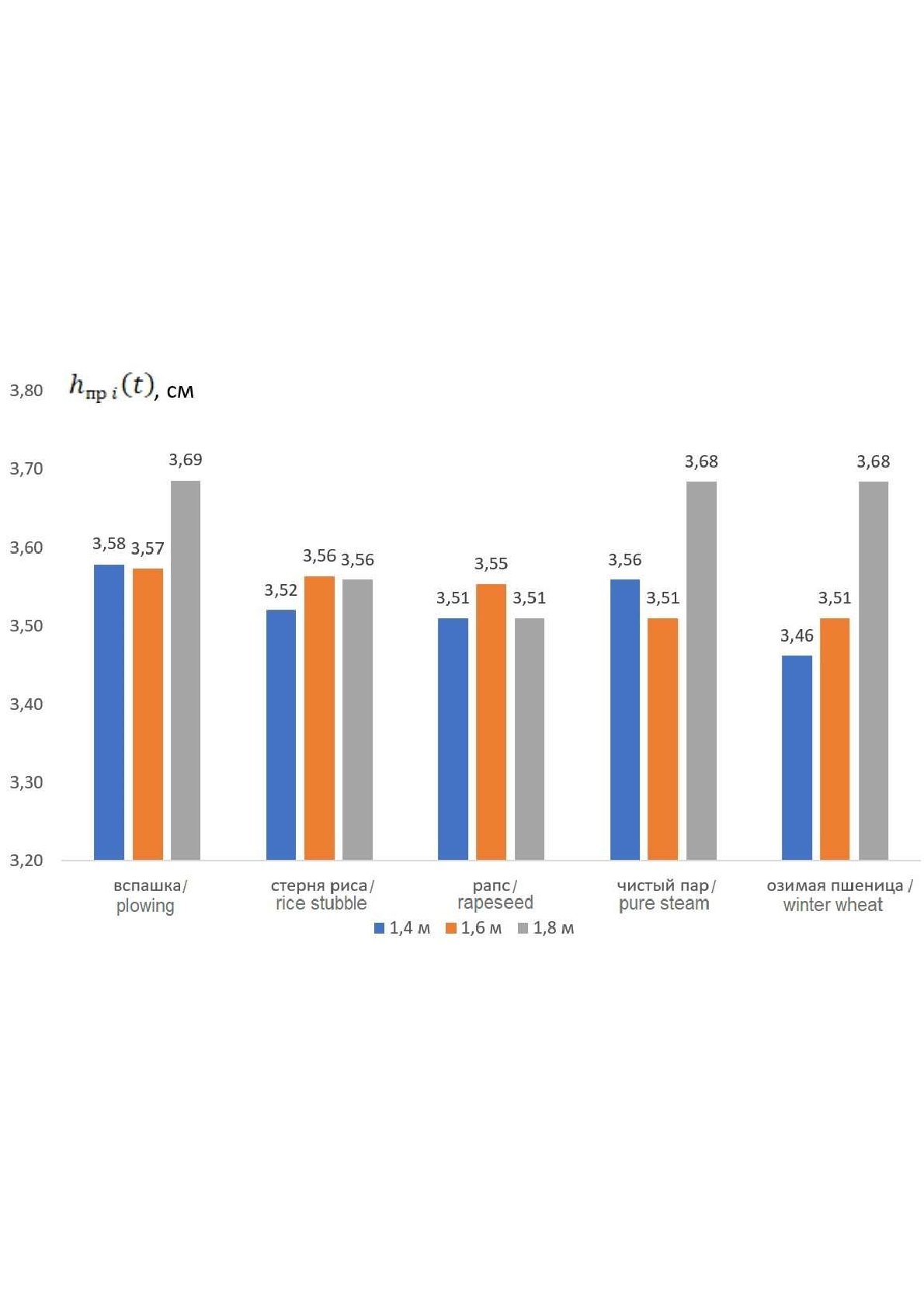 Note. Average values of relief heights under sprayer wheels by agrophon, we obtain: plowing - 4.5 cm; rice stubble – 2.5 cm; rape – 1.3 cm; clean fallow – 1.5 cm; winter wheat – 1 cm. Calculation results are shown in Figures 14 and 15.