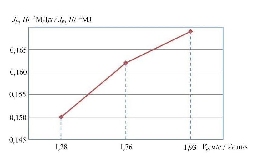 В интервале изменения скорости перемещения рабочего органа от 1,28 до 1,93 м/с количество энергии Jp, затрачиваемое на сжатие почвенного пласта рабочим органом, увеличивается от 0,150·10‒4 до 0,169·10‒4 МДж.