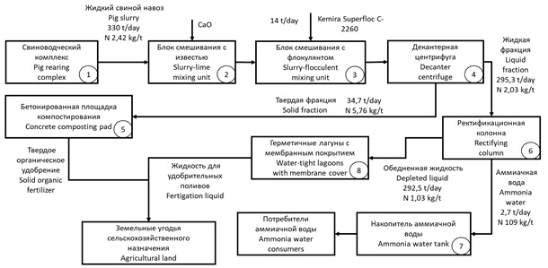 Цель статьи. Определить эффективность технологии переработки свиного навоза, в которую включена ректификация жидкой фракции, по количественным и качественным характеристикам навоза и конечных продуктов, а также проследить перераспределение общего азота между конечными продуктами на примере пилотного свиноводческого комплекса.