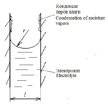 Интенсивность коррозионных процессов в узких щелях объясняется тем, что влага в щелях в сравнении с открытой поверхностью высыхает дольше, и зависит от величины зазора. Это связано с наличием мениска у жидкости, находящейся в щели (рис. 1) [1].