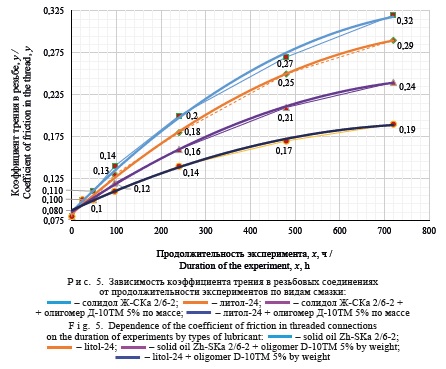 С увеличением продолжительности экспериментов до 720 ч значения коэффициента трения в резьбовых соединениях, обработанных составами № 1 и 2, интенсивно повышаются с 0,08 до 0,32 и 0,29 соответственно, в соединениях с составом № 3 интенсивное повышение коэффициента трения имеет место до 480 ч, затем процесс повышения выравнивается. В соединениях с составом № 4 наблюдается плавное незначительное повышение коэффициента трения, что объясняется отсутствием следов коррозии в резьбовой части соединений. Такое явление хорошо согласуется с данными, полученными авторами трудов [1; 2; 8; 9]. При осмотре резьбовой части крепежных деталей после раскрепления образцов со смазкой № 4 первые незначительные следы коррозии выявлены лишь после 720 ч экспериментов, когда в соединениях, обработанных составами № 1, 2 и 3, следы коррозии выявлены уже через 96, 96 и 240 ч соответственно. Результаты, полученные в рамках данного исследования, превосходят результаты наших исследований в работе [14].