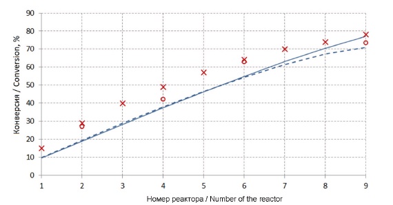 Апробация созданной методологии осуществлялась на реальном производстве. Соотношение бутадиена со стиролом в мономерной фазе по массовым частям составляет 70:30. Для регулирования молекулярной массы применяется трет-додецичный меркаптан, многоточечная подача которого возможна в соответствии с аппаратурным оформлением производства (рис. 2). Массовое соотношение воды к мономерам составляет 220:100. Для прекращения роста конверсии в качестве стоппера применяется диэтилгидроксиламин, который аппаратно вводится в конечный полимеризатор батареи.