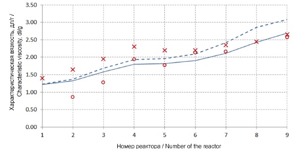 Благодаря возможности имитации модельного времени, т. е. времени ведения эксперимента, можем наблюдать 2 серии кривых (после 15 и после 30 часов моделирования процесса). Очевидно, что 15 часов (штриховая линия) недостаточно для получения качественных расчетных результатов, в то время как 30 часов (сплошная линия) моделирования достаточно для стабилизации получаемых характеристик, которые можно рассматривать как значения, характерные для статических режимов непрерывного производства. Добавление второй порции регулятора в 5 полимеризатор приводит к снижению значений характеристической вязкости, конверсионная зависимость при этом не меняется.