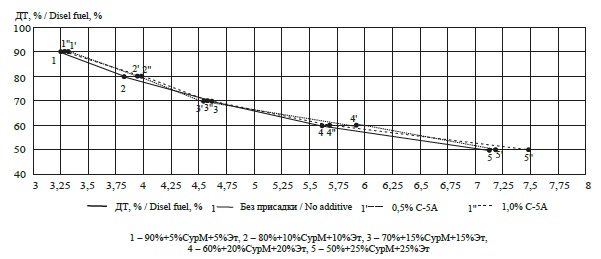 Отмечено, что с увеличением содержания СурМ и Э в ДТ увеличивается кинематическая вязкость (рис. 2). Можно объяснить это тем, что вязкость СурМ существенно выше, чем у ДТ, и составляет vСурМ = 77,2 сСт против vДТ = 4,5 сСт. Наличие в смеси этанола снижает общую вязкость смесевого топлива, но этого недостаточно, чтобы она находилась в рамках, определенных для летнего ДТ (ГОСТ 305–2013 «Топливо дизельное. Технические условия»). Внесение С-5А тоже увеличивает кинематическую вязкость.