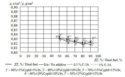 Первоначально были изучены физико-химические свойства смесевых топлив. В качестве объектов для исследования были подготовлены смеси сурепного масла, этилового спирта и ДТ разных концентраций: 5%СурМ+5%Эт+90% ДТ, 10%СурМ+10%Эт+80%ДТ, 15%СурМ+15%Эт+70%ДТ, 20%СурМ+20%Эт+60%ДТ, 25%СурМ+25%Эт+50%ДТ. Кроме этого, в каждый образец было добавлено от 0,5 до 1,0 % диспергирующей присадки С-5А для увеличения времени стабильности смесей. Определяли плотность и кинематическую вязкость, а также время стабильности смесей к фазовому разделению.