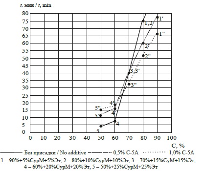 Экспериментально установлено, что при увеличении содержания СурМ и Э в ДТ снижается время стабильности. Положительное влияние присадки было отмечено с 30 % от общего содержания СурМ и Э (рис. 4).