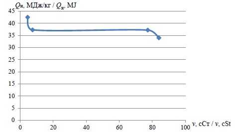 График (рис. 5.) показывает, что с ростом кинематической вязкости смесевых топлив снижается низшая удельная теплота сгорания. Предположительно, данный эффект можно объяснить тем, что масла, обладающие наименьшей вязкостью, быстрее испаряются, и содержание газовой фазы, соответственно, выше, а это значит, что фактическая температура возгорания и низшая удельная теплота сгорания топлив будут выше.