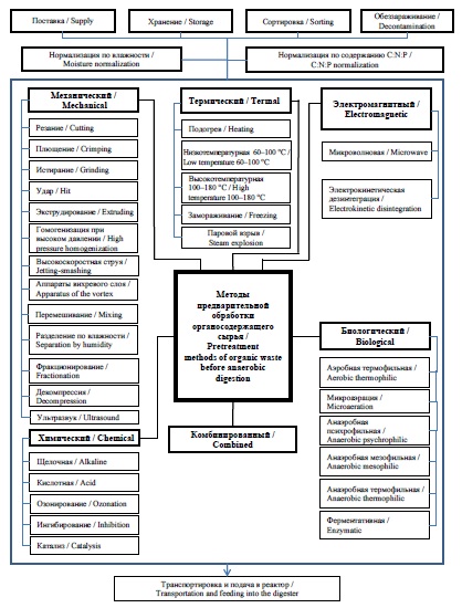 Introduction. The volume of accumulated organ-containing non-recyclable waste products in Russia is increasing. Existing technologies make it possible to recycle these waste products through using anaerobic digestion to produce biogas and fertilizers. The organic portions of waste consist mostly of hard-to-degrade lignin, cellulose, and extracellular polymers, which make anaerobic digestion difficult. Pretreating is necessary to make the raw materials available to microorganisms for bioavailability and deeper degradation. There are many different types of pretreating with their own specific effects on the raw materials. To improve understanding the process of pretreating organic raw materials prior to anaerobic digestion, and to improve the quality of the decisions made, pretreatment methods need to be identified and systematized.