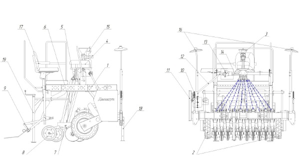 Сеялка селекционная «Деметра» состоит из следующих основных узлов и механизмов: рама 1, опорно-приводные колеса 2, высевающая система, включающая наполнительную воронку 3, конический дозатор 4, ротационный распределитель с электродвигателем 5, телескопические семяпроводы 6, сошники 7, прикатывающие колеса 8, загортачи (мульчер) 9, механизм привода (опорно-приводные колеса 2, редуктор 10, зубчатый перебор 11, карданный вал 12, конический редуктор 13, цепная передача 14), рукоятка открытия наполнительной воронки или электромагнитный клапан (в зависимости от комплектации) 15, гидрофицированные маркеры 16, кресло оператора 17, центральная опора 18, винтовые домкраты 19 (рис. 2).