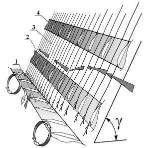 Принцип работы наклонного комлеподбивателя основан на смещении ленты стеблей 3 вниз под действием силы тяжести в процессе их транспортирования конвейерами 2 и 4. Смещение стеблей происходит до касания комлями поверхности 1, которая наносит по ним встречные удары.