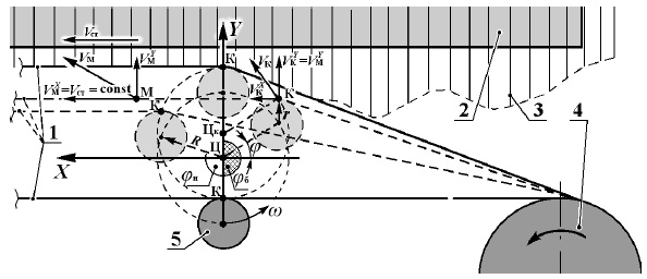 Поскольку работа комлеподбивателя производится с постоянным соблюдением условия (1), то все дальнейшие исследования кинематики движения точки М его рабочей поверхности будем выполнять только относительно оси Y. С учетом сказанного вероятность нанесения эффективных ударов определяем с помощью графического анализа зависимостей (9) и (11) (рис. 4). При этом анализировать движение точки М будем относительно центра вращения ЦК точки К контакта ролика с комлеподбивающей поверхностью (рис. 3).
