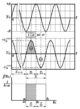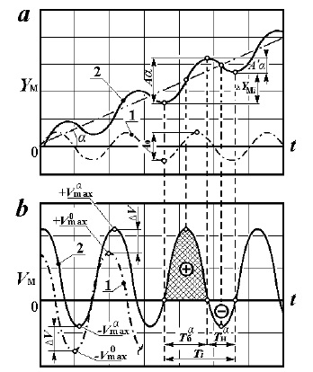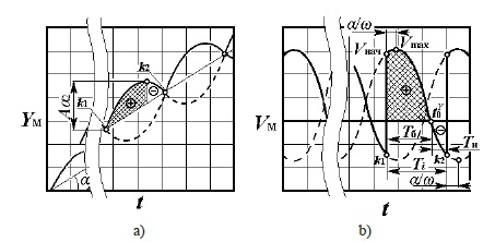 Каждая группа фаз на графике VМ(t) (рис. 6) начинается и заканчивается в точках пересечения кривой 2 и оси t. В этих точках проекция вектора скорости КП на ось Y равна нулю:
