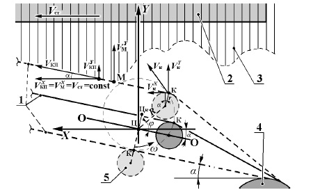 Движение точки М в координатной плоскости ЦXY зависит от характера движения точки К контакта ролика с КП. В произвольном положении ролика точка К имеет координаты: