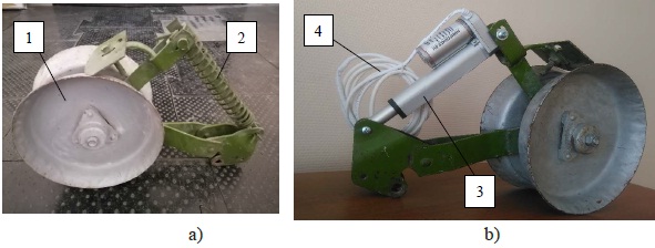- Система автоматического контроля глубины обработки почвы. Для этого внесены изменения в механизм регулировки опорного колеса, совершающего вертикальное перемещение в соответствии с разработанным алгоритмом.