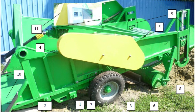 1 – лемех подкапывающий; 2, 8 – прутковый элеватор; 3 – датчик веса подкапывающего лемеха;