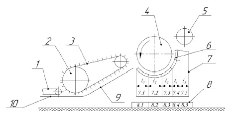 2 – inclined chamber; 3 – slat conveyor; 4 – threshing drum; 5 – beater; 6 – treshing sections;