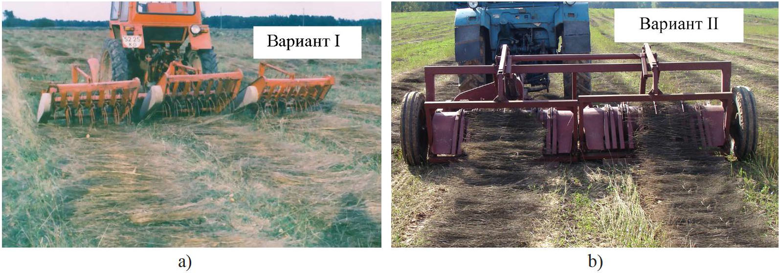F i g. 1. The VL-3 tedder (option I) – a) and the experimental fluffer (option II) – b) during the experiments