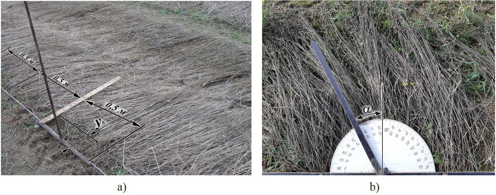 Сбор информации для оценки влияния разных вспушивателей на процесс перекосов стеблей в ленте α(L) выполняли путем замера максимальных углов α отклонения стеблей от перпендикуляра к направлению движения агрегата. Поскольку разные направления перекосов стеблей одинаково негативно влияют на пригодность слоя к трепанию, то при выполнении замеров, в том числе и при отборе проб с перекрещиванием стеблей в ленте, фиксировали абсолютные значения показателя – | α |.