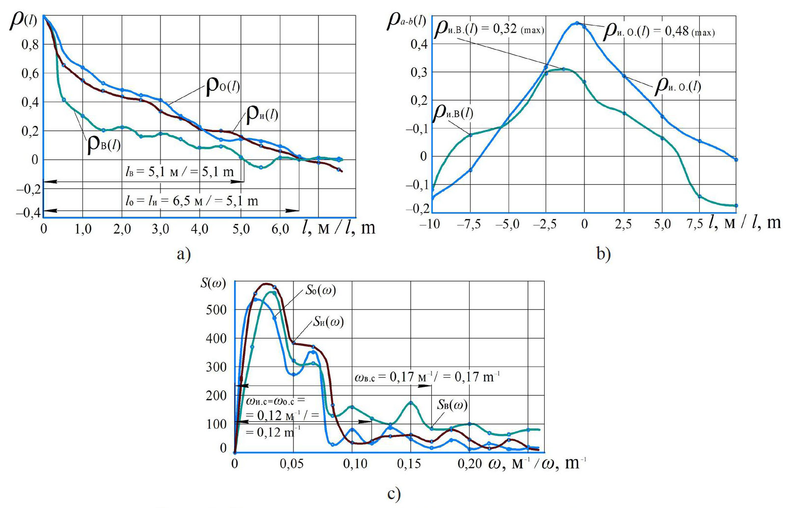 В результате обработки первичной информации о процессах Yк(L) изменения кривизны лент стеблей льна получили нормированные корреляционные функции ρ(l), взаимные корреляционные функции ρa−b(l) и спектральные плотности S(ω) изучаемых объектов (рис. 3).