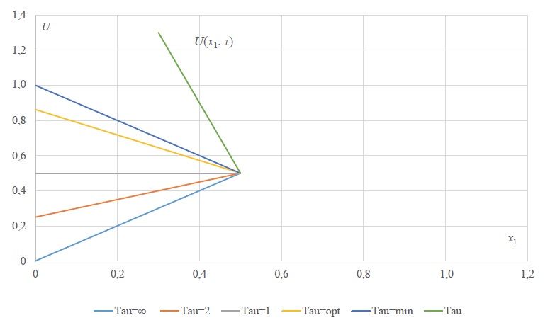 На рисунке 2 приведена графическая иллюстрация связей между переменными в уравнении (12). Из уравнений (11) и (12) следует, что начальная амплитуда управления U(x1(0) = 0) обратно пропорциональна параметру τ. При τ ≤ τмин (рис. 2) начальный участок управления в программном движении, как в задаче быстродействия, принадлежит ограничению на управление U = 1 и чем больше xк, тем при больших τмин выходим на это ограничение, что следует и из связи . Это означает, что при больших диапазонах заданных граничных условий в программном движении исчезает эффект энергосберегающего управления и оно приближается к оптимальному управлению по быстродействию [2].