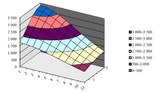 Расчетные значения освещенности соответствовали данным натурных измерений в пределах точности люксметра. На рабочей поверхности с размещенными на ней контейнерами с растениями наблюдался существенный градиент освещенности. Численно значения освещенности в местах размещения контейнеров показаны в таблице 1. Максимальное для всей поверхности значение освещенности Emax = 3 316 лк наблюдалось непосредственно под светильником, минимальное Emin = 763 лк – в точке, максимально удаленной от проекции светильника на рабочую поверхность. Значение коэффициента равномерности для всей рабочей поверхности составляет z = 2,51.