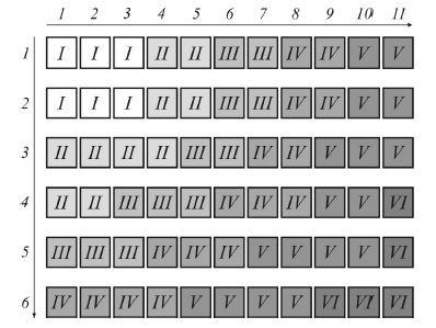 Однако для анализа создаваемого градиента необходима картина освещенности в дискретных точках поверхности (местах размещения контейнеров с растениями, характеризуемых их центрами). Группировка контейнеров с растениями по принадлежности к зонам освещенности показана на рисунке 3. Дипазон различий в освещенности, как и на рисунке 2, принят DE = 500 лк.
