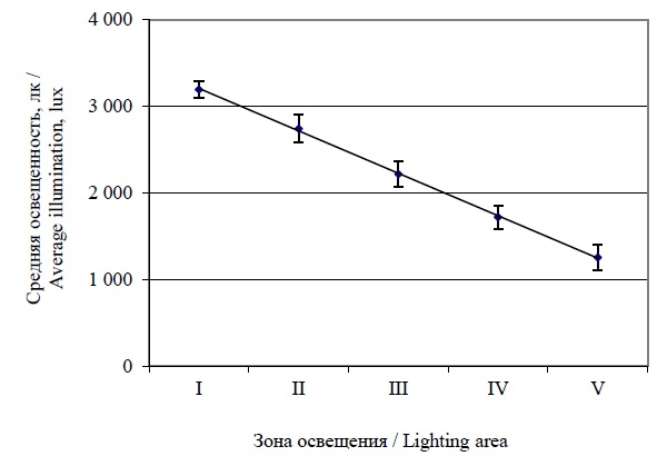 На рисунке 4 показаны средние значения освещенности Ē по зонам и ее разброс ±σ. Таким образом, использование градиентного подхода к организации эксперимента предоставляет возможность создания равномерной шкалы освещенности.