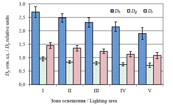 Как и ожидалось, основное поглощение света листьями наблюдается в синем спектральном диапазоне, наименьшее – в зеленом. Оптическая плотность листьев во всех диапазонах падает с уменьшением величины освещенности. Дисперсионный анализ показал статистически значимые различия средних значений освещенности в отдельных зонах (p < 0,05).