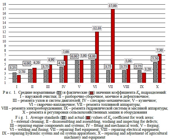 Fig. 1. Average standards and actual values of Kп coefficient for work areas:
