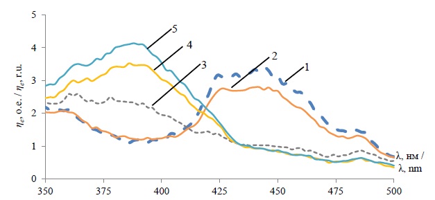 Измерения спектров возбуждения и люминесценции проводили на спектрофлуориметре «Флюорат-02-Панорама» (производство фирмы «Люмэкс», Россия) с программным обеспечением PanoramaPro. Производили измерения спектральных характеристик возбуждения (поглощения) ηe(λ) в диапазоне 200–500 нм по методике, описанной в другой работе [28]. Повторность измерений десятикратная. Для измерения спектра люминесценции φl(λ) монохроматор возбуждения устанавливали на ту же длину волны, на которой наблюдается максимум спектра возбуждения при синхронном сканировании. Монохроматор регистрации люминесценции сканирует более длинноволновую область. Все спектры были скорректированы на инструментальные искажения возбуждения с помощью программных средств PanoramaPro. По полученным спектральным характеристикам определяли интегральную поглощательную способность Η по формуле: