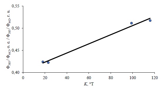 Для повышения чувствительности метода целесообразно измерять не абсолютное значение потока, а их соотношение Φ385 / Φ442. При практической реализации это уменьшит влияние флуктуаций абсолютных величин потоков фотолюминесценции. Зависимость Φ385 / Φ442 (K) представлена на рисунке 4.