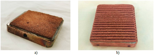 In order to understand the effect of copper foam parameters on heat transfer performance, three groups of porosity samples were studied, which were 70, 80 and 90%, respectively. Each group contains two kinds of pore densities: 90 and 110 PPI. Figure 1 shows copper foam samples without groove (a) and with groove (b). The size of copper foam sample is 28 mm (length) × 28 mm (width) × 2 mm (thickness). The grooved copper foams have two specifications: 11 and 17 grooves. The groove is processed by wire cutting method. The corresponding rib widths are 2 and 1 mm, with groove depth 2.9 mm and width 0.6 mm, shown in Figure 2.